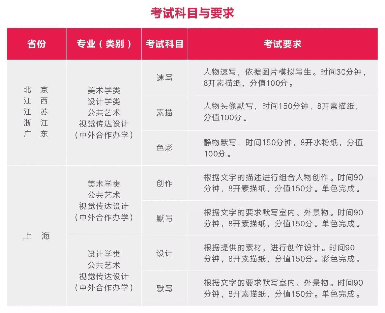 备注:上海考生可兼考美术类和设计类,其中默写为公共考试科目,只需一次考试。